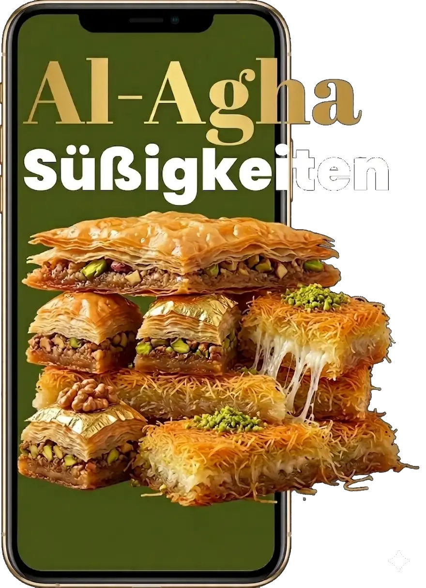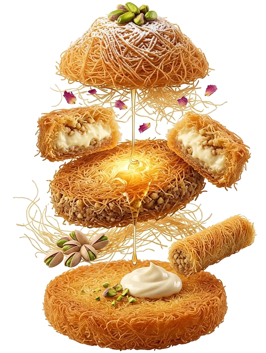 „Erleben Sie die Perfektion orientalischer Konditorkunst. Unsere handgemachte Kunafa vereint knusprige goldgelbe Teigfäden mit einer cremigen Füllung, veredelt durch einen Hauch von edlem Rosenwasser und feinstem Sirup. Jedes Stück ist ein Meisterwerk der Tradition – frisch gebacken nach Originalrezepten aus Damaskus, um Ihre Sinne auf eine Reise in den Orient zu entführen.“
